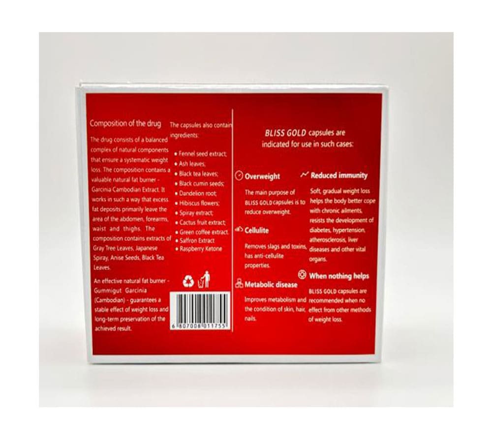 Bliss Gold est une formule amincissante haut de gamme, conçue pour celles et ceux qui recherchent une silhouette élancée sans compromettre leur santé ni leur bien-être intérieur. Grâce à une composition équilibrée à base d’ingrédients naturels, Bliss Gold aide l’organisme à se délester en douceur de l’excès de poids, améliore le métabolisme et soutient une remise en forme globale 🌿.